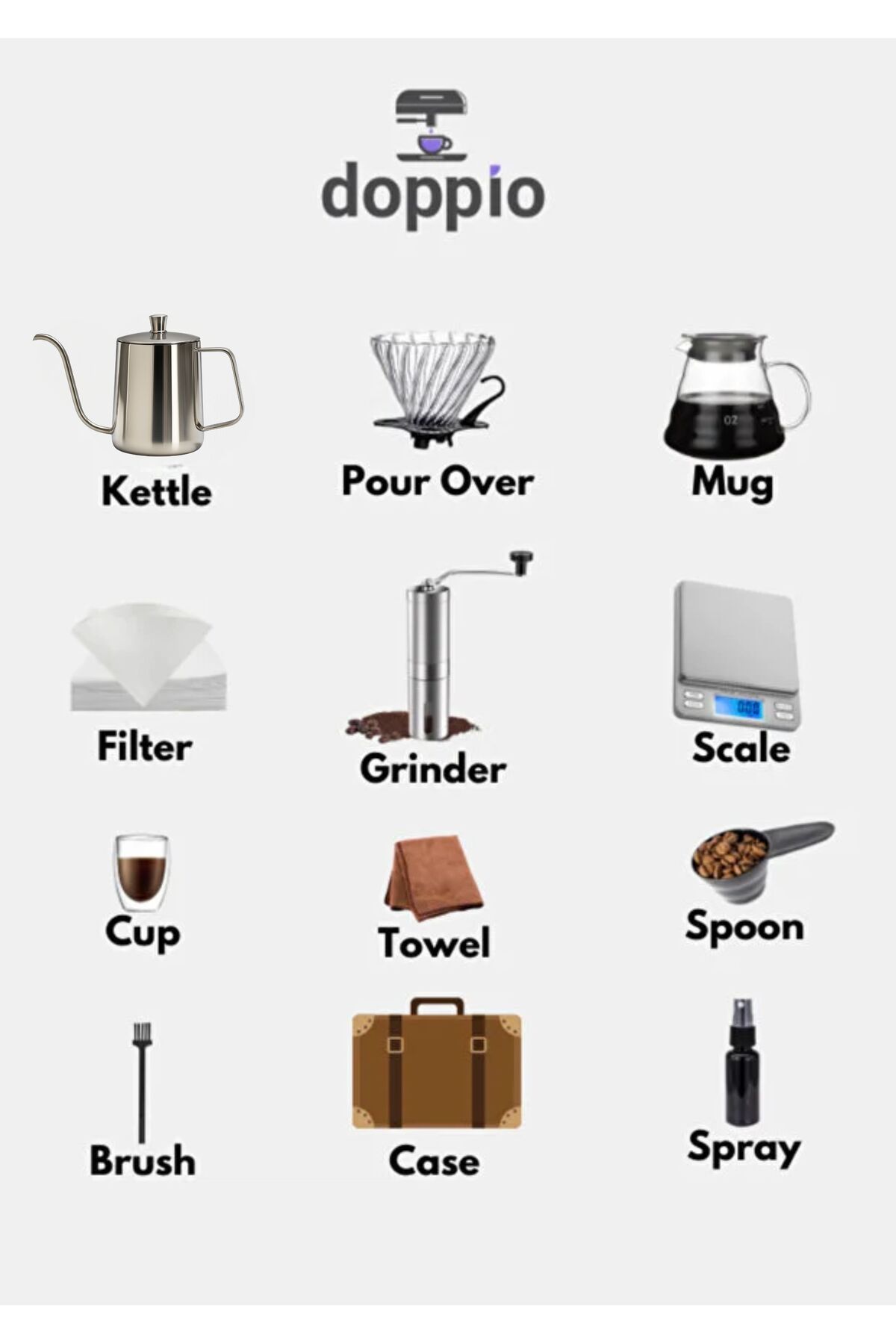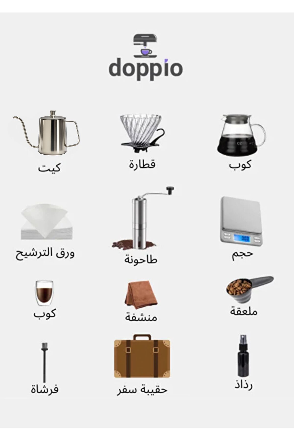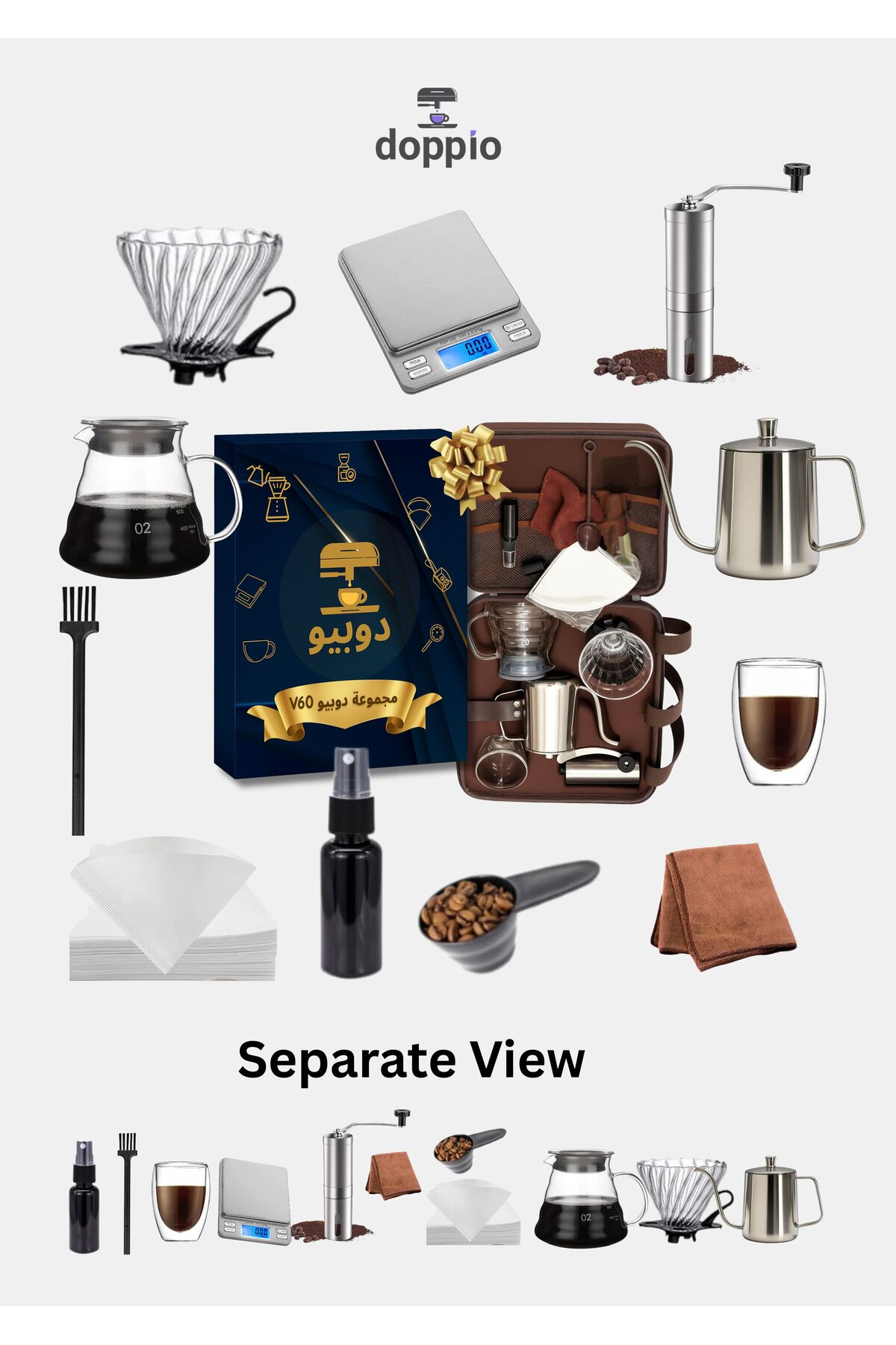 المكونات: إبريق V60، قمع، مطحنة يدوية، قطارة، أكواب، أدوات قياس، ملحقات أخرى